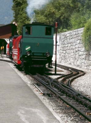 Eine Garnitur der Rothorn-Bahn keucht aus dem Lokschuppen zum Brienzer Talbahnhof.
