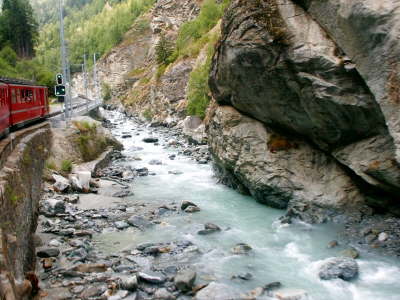 Entlang eines tosenden Wildbachs überwindet der Glacier-Express den Höhenunterschied zwischen Visp und Zermatt.